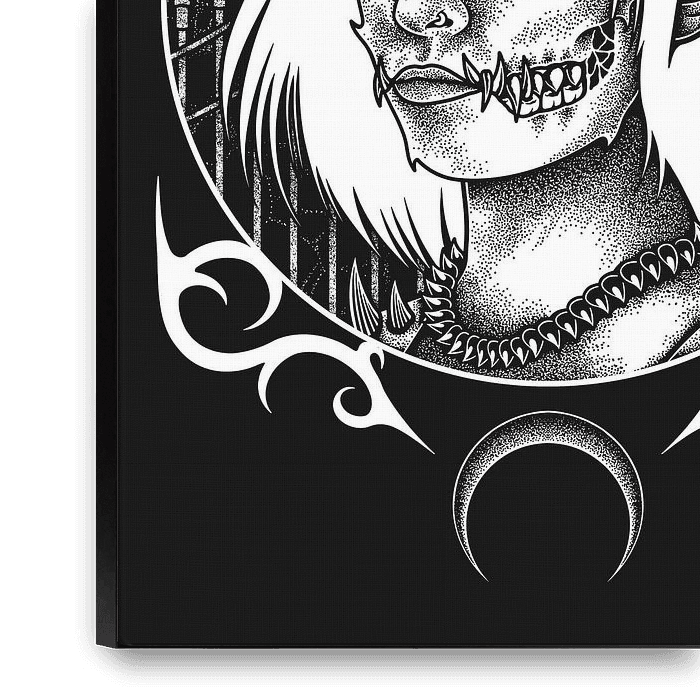 Tauchen Sie ein in die eindringliche Schönheit des Übernatürlichen mit dieser eindrucksvollen gotischen Porträtillustration. Die zentrale Figur ist eine Jungfrau der Nacht, deren Gesicht von einem makabren und aufwendig detaillierten, vernähten Mund geprägt ist, der scharfe, raubtierhafte Zähne offenbart. Ihre Augen sind als hohle,…