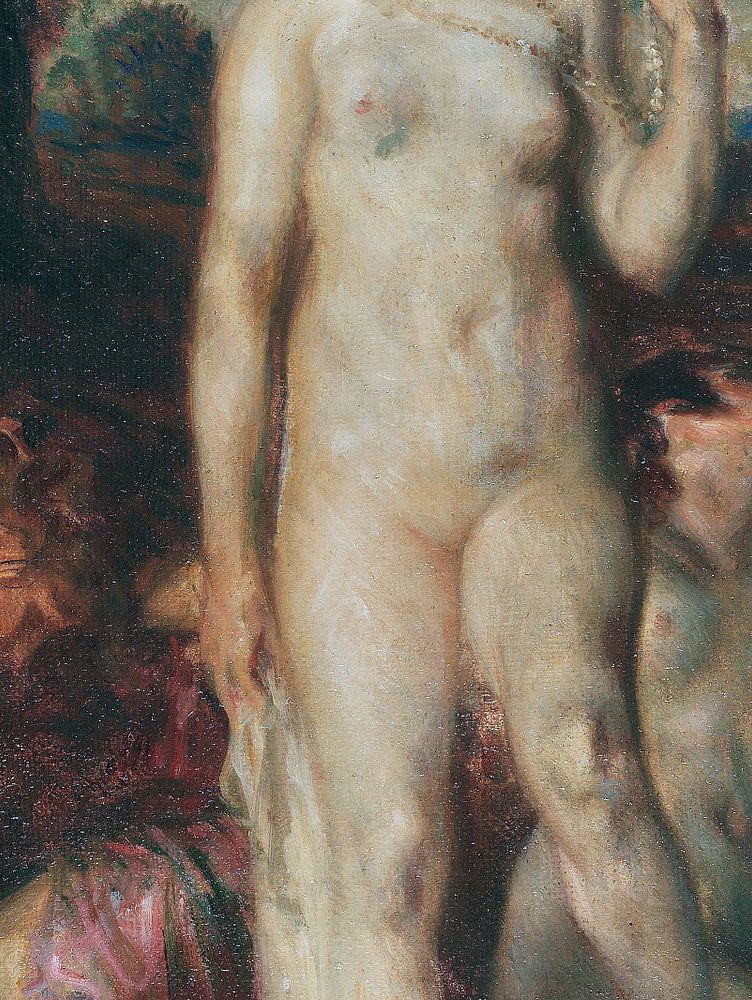 Normalerweise und auch hier werden sie als drei nackte Frauen dargestellt. Links liegt eines der Mädchen nackt auf dem Boden und lässt Bein, Hüfte, Gesäß, Torso und Brüste auf dem Porträt frei. In der Mitte ist ein Aktmodell frontal auf dem Aktportrait abgebildet und rechts sitzt wieder die dritte Frau.