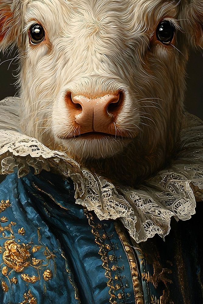 Eine majestätische Kuh in einem luxuriösen blauen Mantel mit feinem Kragen bringt eine humorvolle und künstlerische Sicht auf den aristokratischen Stil in diesem einzigartigen Bild.