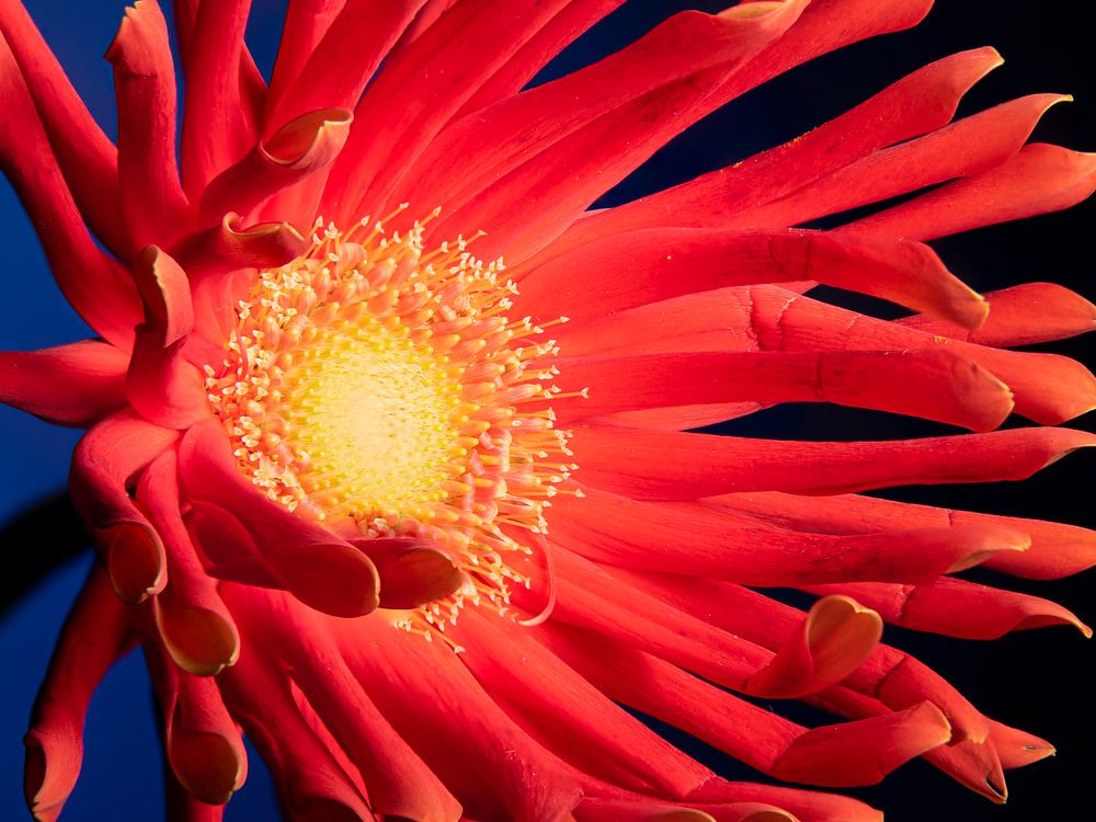 "Die fröhliche rot-gelbe Gerbera mit blauem Hintergrund".