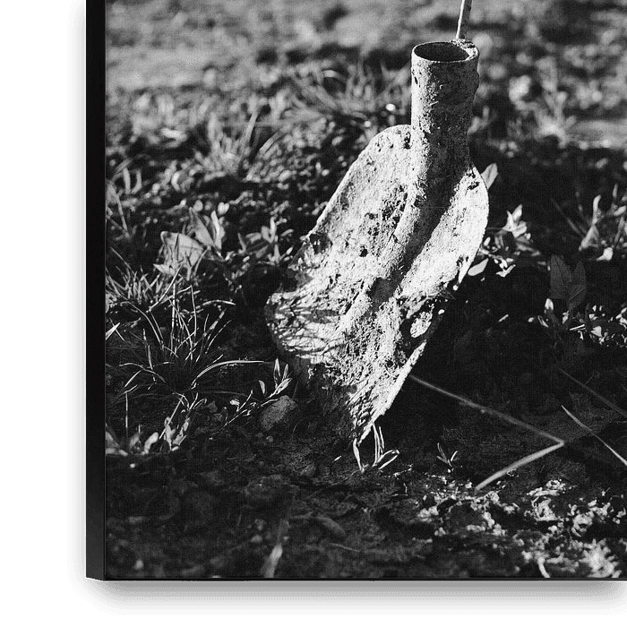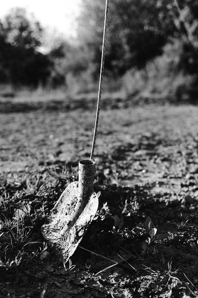 Dieses Werk zeigt die Einfachheit und Kraft eines ruhigen Moments auf dem Lande. In der Mitte der Skulptur steht ein Spaten schräg in der Erde, grob strukturiert und mit getrockneter Erde bedeckt. Der Stiel fehlt, so dass nur der Metallkopf als stummer Zeuge der hier geleisteten Arbeit stehen bleibt. Das scharfe Morgen- oder Abendlicht…