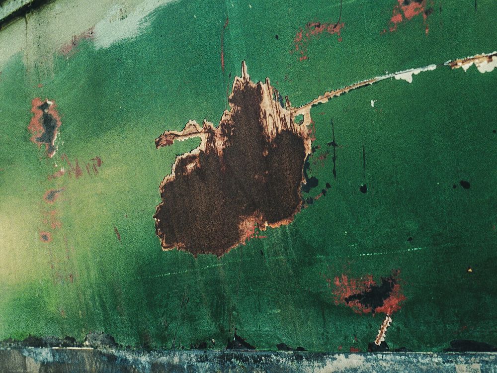 Ein altes grünes Boot liegt auf Böcken am Ufer und wird gewartet. Es verdient etwas Aufmerksamkeit. Es gibt kahle Stellen mit Rost, die Farbe ist beschädigt, zerkratzt. Trotzdem glänzt es schön. Wir sehen die Reflexion eines gelben Objekts außerhalb des Bildes. Dadurch entstehen alle möglichen Grüntöne. Das Wetter ist gut und einigermaßen klar. Das Licht ist sehr niederländisch, der Himmel ist irgendwie weiß und nicht düster. Das Foto wurde mit einer alten Kamera mit Rollfilm aufgenommen. Also das, was man analoge Aufnahme nennt. Der Film ist altmodisch nass entwickelt, aber digital nachbearbeitet. Die Farben sind auch etwas altmodisch, vintage. So entsteht eine alte Atmosphäre, in der man sich eine Geschichte zu diesem Foto ausmalen kann. Sie können ein paar Bullaugen sehen, Schiffsfenster. Das Boot ist überall gewesen. Sie reisten in ein fernes Land und lagen am Kai in der Sonne. Von dort aus blickst du über das ruhige Wasser im Hafen. Es war heiß, und schwül. Du hast nichts anderes getan als nur...