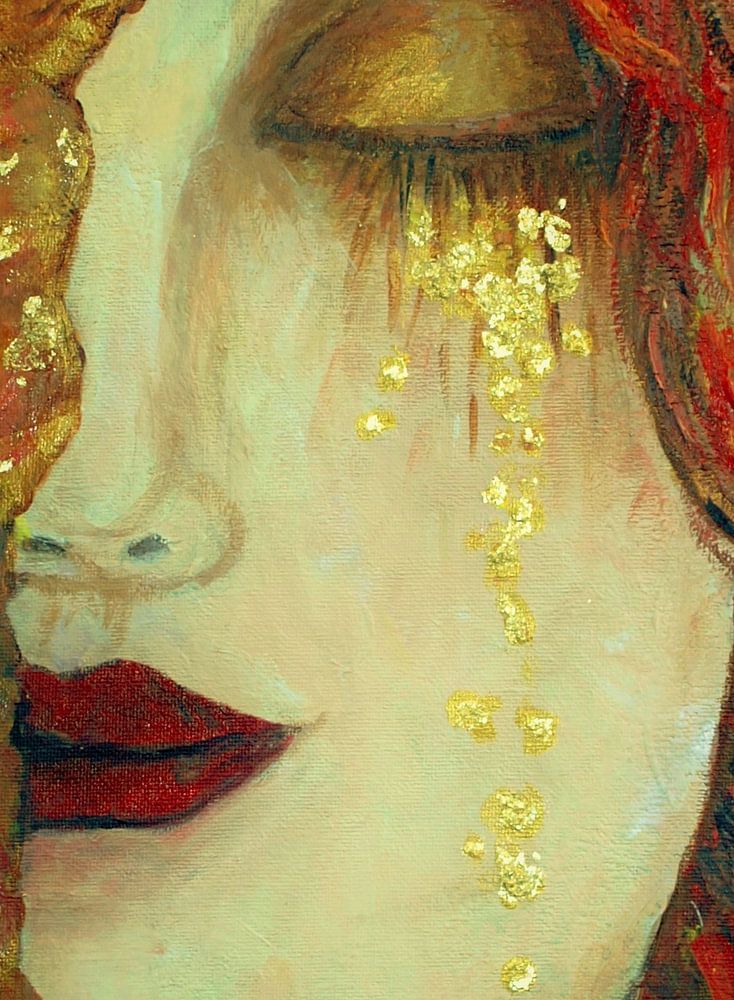 Acrylgemälde der Goldenen Tränen, inspiriert von Gustav Klimt. Ein Maler, der sich von van Gogh inspirieren ließ. Eine andere Art der Malerei in den 1900er Jahren. Kombination von Farbe, abstrakter Kunst, figurativer Kunst, Ausdruck, innovative Suche nach einer anderen neuen Kunstform. Jugendstil / Porträt / Frau / Gesicht / Abstrakte Kunst / Träne / Gustav Klimts Träne / Trauer / Gold / Farbe / Inspiration / Art Deco/ Art Nouveaux / Vintage-Stil / Figurative Kunst/ Rote Haare