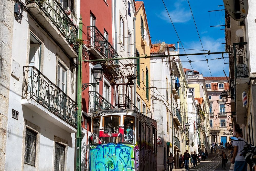 Eine ikonische Szene in den Straßen von Lissabon entfaltet sich in diesem atemberaubenden Foto einer Straßenbahn, die sich ihren Weg durch die gepflasterten Straßen bahnt. Die charakteristische Straßenbahn mit ihrem nostalgischen Charme fährt durch die pulsierende Stadt und ist ein zeitloses Symbol ihres Erbes.
