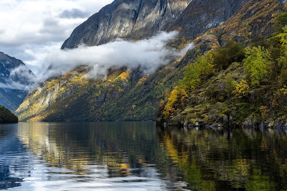 Im tiefsten Herbst zeigt sich der Nærøyfjord von seiner mystischsten Seite. Die Wasseroberfläche ist ein perfekter Spiegel, so ruhig, dass sie die steilen Berge wie in einer Parallelwelt reflektiert. Die Farben des Herbstes - warme Gold-, Kupfer- und tiefe Grüntöne - verstärken den Kontrast zu den blassen Wolken, die wie Schleier zwischen den Berggipfeln hängen.