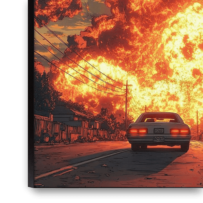 Ein einsames Auto rast eine verlassene Straße hinunter, während eine gewaltige Explosion den Horizont verschlingt. Dieses filmische Meisterwerk fängt die rohe Intensität der Zerstörung ein, die mit der unheimlichen Ruhe der Fahrt eines einzelnen Fahrzeugs durch das Chaos kontrastiert wird. Die feurige Eruption beleuchtet die Szene mit…
