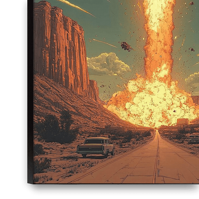 Ein einsames Auto rast eine verlassene Straße hinunter, während eine gewaltige Explosion den Horizont verschlingt. Dieses filmische Meisterwerk fängt die rohe Intensität der Zerstörung ein, die mit der unheimlichen Ruhe der Fahrt eines einzelnen Fahrzeugs durch das Chaos kontrastiert wird. Die feurige Eruption beleuchtet die Szene mit…