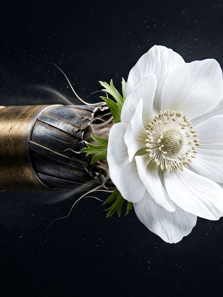 Ein Moment, in dem Gewalt sich dafür entscheidet, Leben zu werden. Dieses Werk spiegelt einen stillen Wendepunkt wider – an dem selbst die kleinste Geste Zerstörung in etwas Sanftes verwandeln kann und uns daran erinnert, dass Frieden immer eine Entscheidung ist