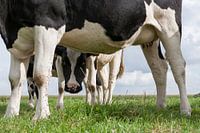 Een nieuwsgierige koe die onder een ander koe doorkijkt