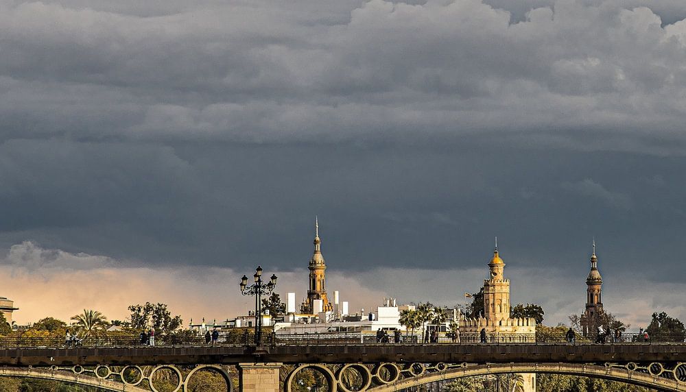 Abendlicht auf der spanischen Altstadt von Sevilla am Fluss Qualdalquivir mit der Brücke Puente de la Barqueta im Vordergrund.