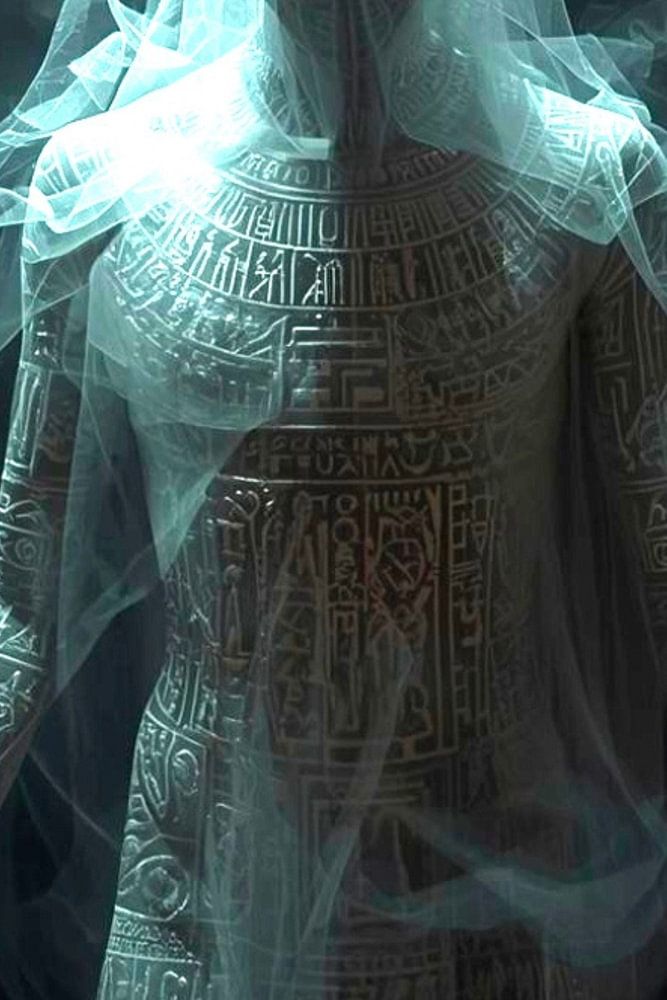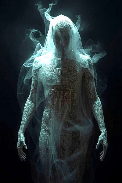 يقف شكل قديم أثيري ملفوفا بالهيروغليفية المتوهجة، وجهه مخفي خلف حجاب شفاف من الضباب والضوء. الجسد مغطى بالكامل بنقوش مصرية مقدسة تبدو وكأنها تتنفس وتنبض بطاقة منسية. Dieses Werk ist eine visuelle Reflexion über verborgene Weisheit, die Geheimnisse, die in der Zeit verborgen sind, und die stille Geburt der Seele nach…
