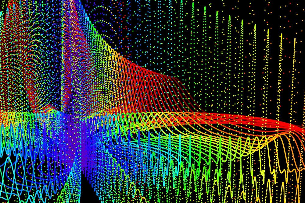 Diffracted Metropolis: Eine virtuelle Struktur, geschaffen aus Beugungskurven verschiedener Spektralfarben. Jede Kurve wird als eine Reihe von Punkten angezeigt. Erstellt mit benutzerdefiniertem Computercode.
