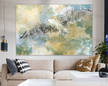 Durch digitale Bearbeitungstechniken und einem selbstgemalten Hintergrund wurde die Möwe in eine abstrakte Szene integriert. Sie scheint sich darin regelrecht aufzulösen.