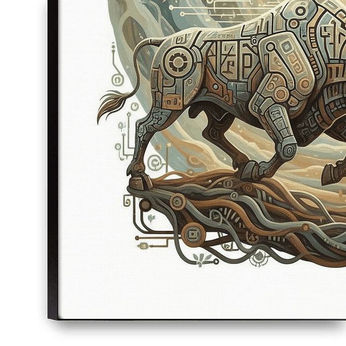 Werden Sie Zeuge einer fesselnden Konvergenz von roher Urkraft und modernster digitaler Kunstfertigkeit. 'Digital Dominion' präsentiert einen majestätischen Stier und einen hochfliegenden Adler, die als komplizierte kybernetische Gebilde neu erschaffen wurden, deren Formen von Schaltkreisen und Datenströmen durchzogen sind.…