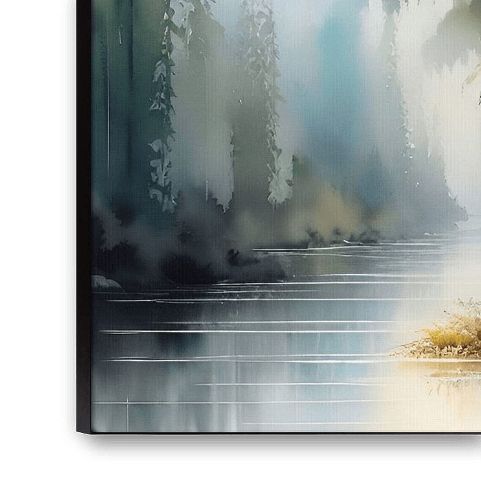 Ein digitales Gemälde einer Landschaft. Es sieht aus wie ein Aquarell in verschiedenen Blau-, Grün-, Grau- und Gelbtönen. Es ist Herbst, die Bäume färben sich bereits ein wenig orange. Der Himmel ist bewölkt. Das Gras hat einen herbstlichen Orange-Ton. Der Nebel über dem glatten Wasser schafft eine ruhige Atmosphäre in Ihrem Interieur.