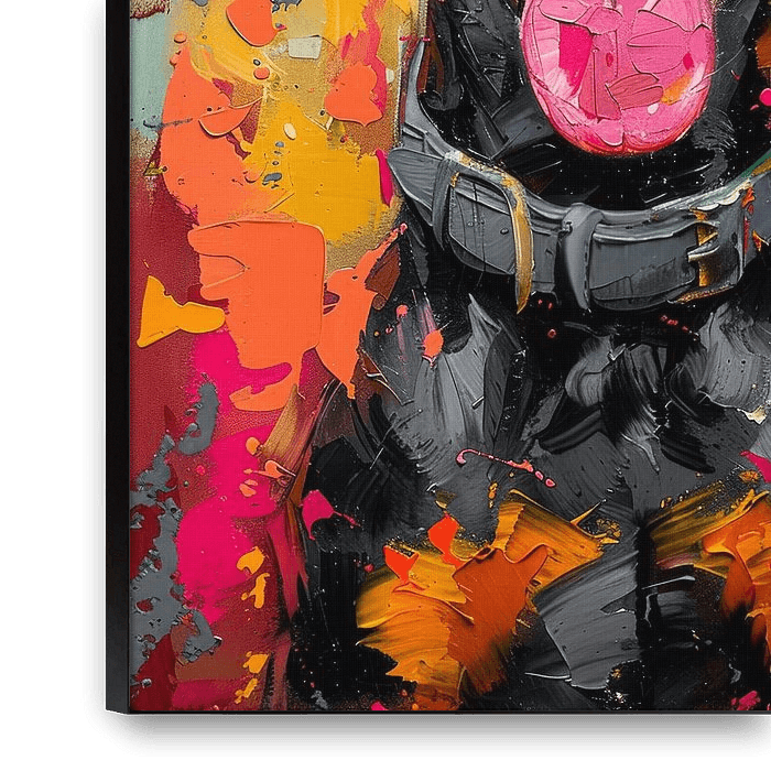 Dieses Bild präsentiert den Dobermann, ein Symbol für Eleganz und Kraft, umhüllt von einem Sturm lebhafter Farben, der seine kraftvolle Präsenz unterstreicht. Der offene, freudige Ausdruck des Dobermanns, eingefangen in einer Momentaufnahme voller Energie und Lebensfreude, wird durch die warmen, abstrakten Farbtöne im Hintergrund…