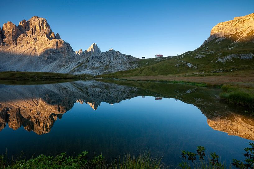 Dolomitenlandschaft bei Sonnenaufgang. Panorama mit dem Paternkofel und der Spitze der Drei Zinnen, daneben die Dreizinnenhütte, die sich im Bergsee Bödensee spiegeln. Die Umgebung der Drei Zinnen, auch Tre Cime di Lavaredo genannt, ist bei Bergfreunden wegen ihrer spektakulären Landschaften beliebt. Die Berglandschaft ist beeindruckend…