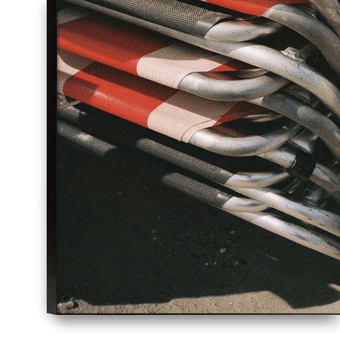 Eine Reihe von Strandliegen in Domburg, fein säuberlich aufgereiht im weichen Sand. Dieses stimmungsvolle Foto strahlt Ruhe, Raum und Rhythmus aus - genau so, wie man sich an der seeländischen Küste fühlt. Ideal als Wanddekoration für Liebhaber von Holland, Strand und ruhigen Momenten.