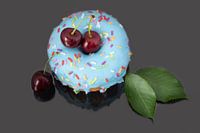 Ein blauer Donut mit roten Kirschen und Kirschblättern von oben vor grauem Hintergrund fotografiert