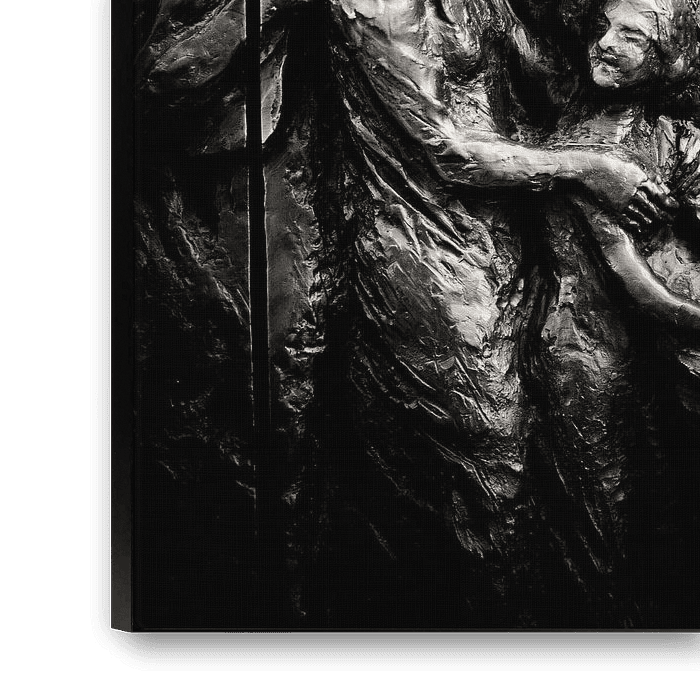 Zwart-wit foto van een kerkdeur in Ljubijana, Slovenie, waarop vele hoofden staan.