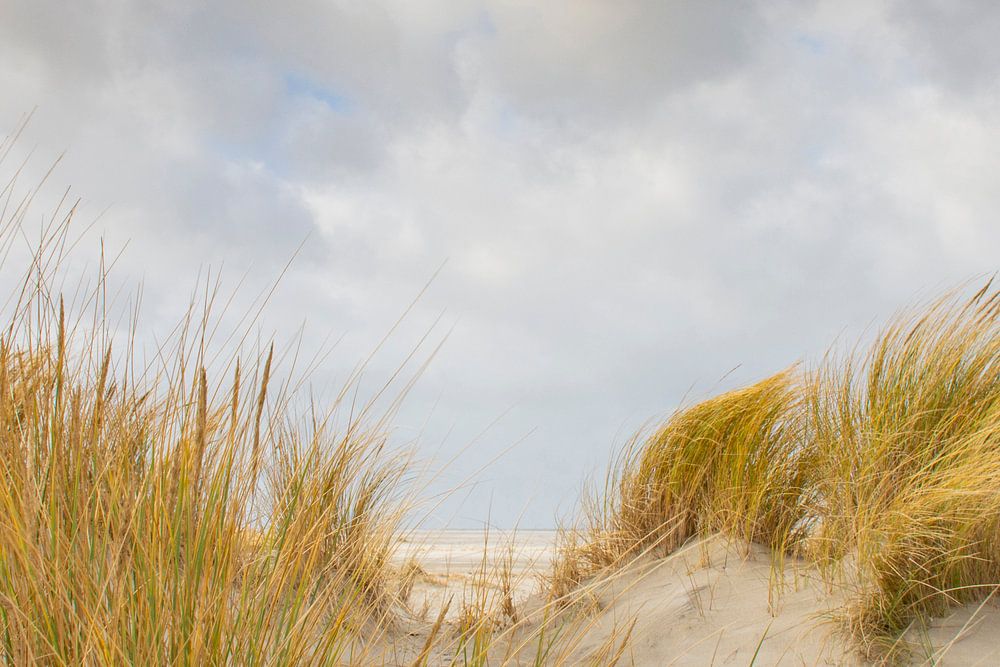 Doorkijkje duinen naar strand van Nationaal Park Schiermonnikoog tijdens een stormachtige dag met sfeervolle wolken.