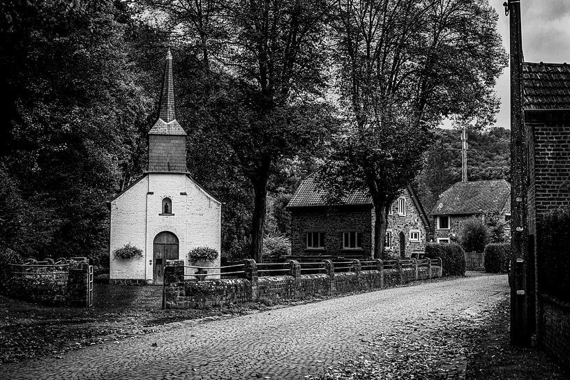 Ein stimmungsvolles Schwarz-Weiß-Bild eines ruhigen Dorfes, in dem sich Kopfsteinpflaster, Bäume und eine kleine Kapelle zu einem zeitlosen Ganzen verbinden. Die Komposition strahlt Einfachheit, Geschichte und Ruhe aus. Ein charaktervoller Kunstdruck, der perfekt in ein klassisches, ländliches oder minimalistisches Interieur passt und…