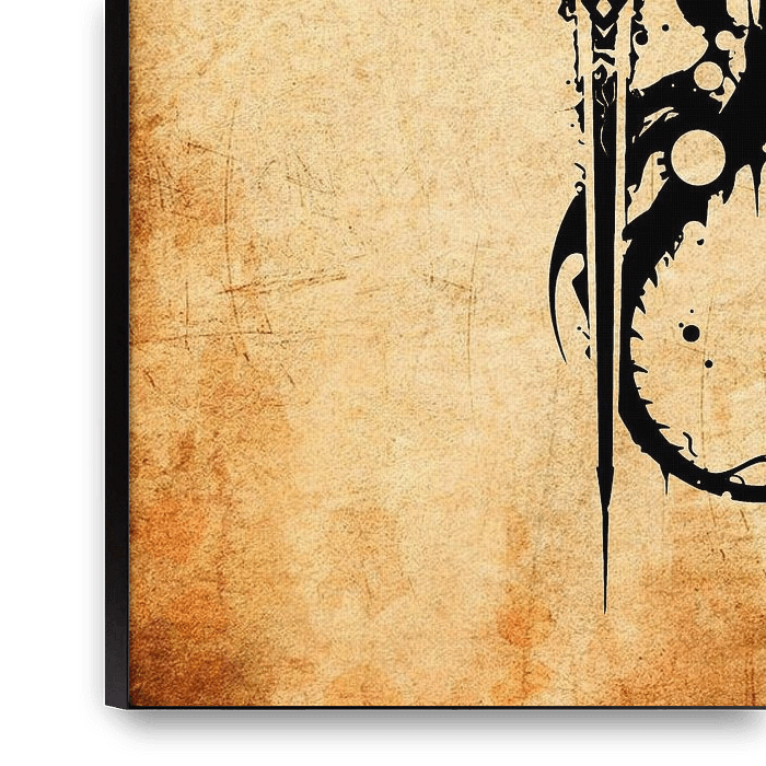 Das Bild zeigt die schwarze Silhouette eines Drachens, der ein Schwert umschlingt, vor einem strukturierten, gealterten Pergamenthintergrund. Die Flügel des Drachens sind ausgebreitet, und sein Schwanz windet sich um den Griff des Schwertes. Das Schwert hat eine scharfe Spitze und einen runden Schutz. Das Bild ist in einem dunklen und…