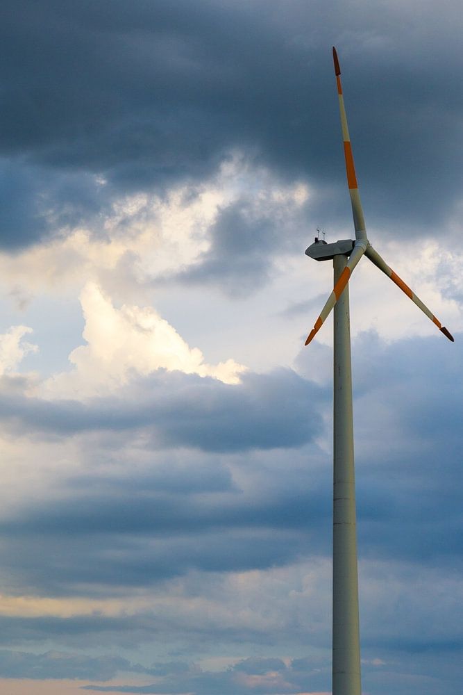 Dramatischer Himmel über einer Windkraftanlage auf der grünen Wiese