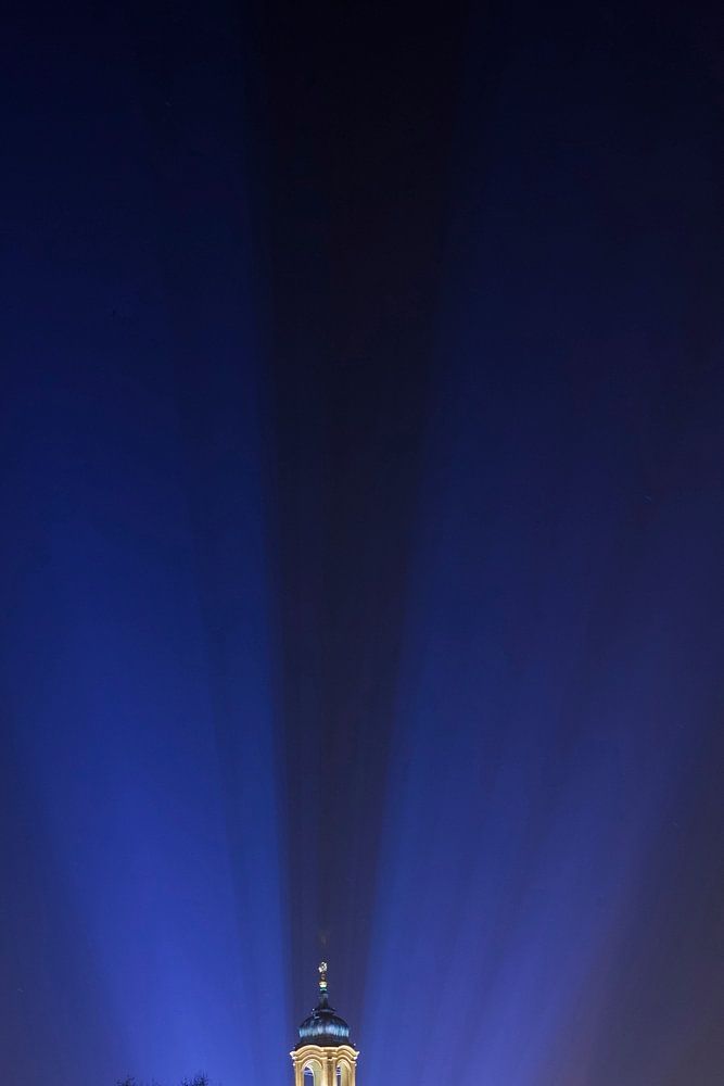Skyline von Dresden nit Scheinwerfern hinter der Frauenkirche