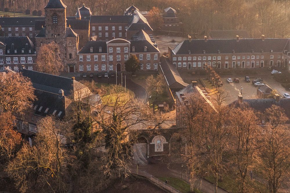 Drohnenaufnahme des Sonnenaufgangs bei Klooster Rolduc in Südlimburg