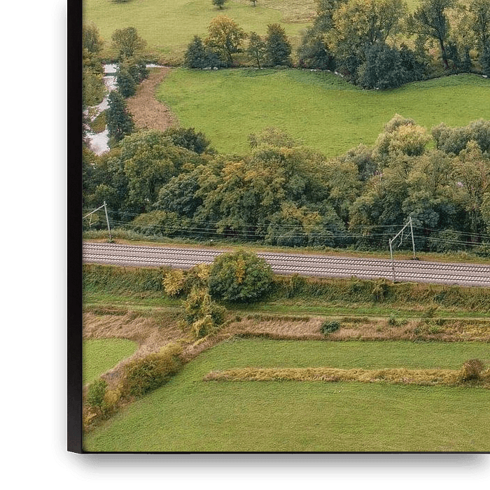 Bestelle dieses Landschafts-Wandbild Drohnenaufnahme eines Arriva-Zugs bei Oud-Valkenburg von John Kreukniet als Reproduktion auf Leinwand, Alu-Dibond, als Poster, Fototapete oder Acrylglasbild.