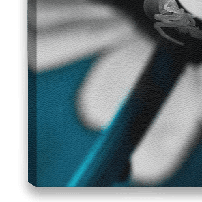 Een bewerkte close-up foto van een Margriet met druppels op de bloem. Onder de bloemblaadjes schuilt een kleine spin. Het geel van de bloem steekt mooi af tegen een blauwe achtergrond.