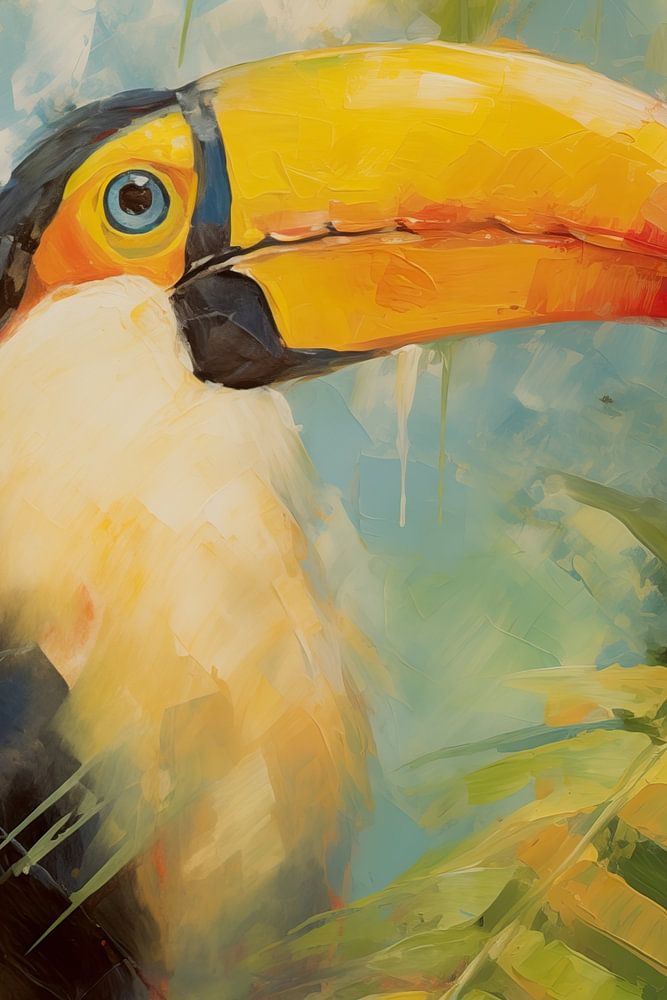 Dieses Werk aus der Serie Faded Dreams zeigt das Porträt eines Tukans, der von Blättern im Dschungel umgeben ist. Die Farbpalette des Kunstwerks ist gedämpft, aber lebendig und verleiht Ihrem Interieur einen verträumten Vintage-Look!