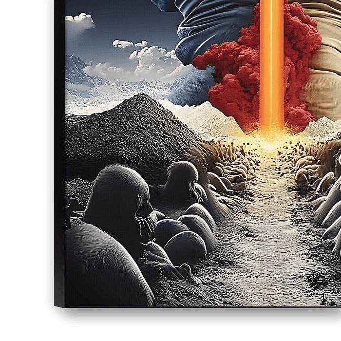 Eine atemberaubende Darstellung des kosmischen Gleichgewichts. Dieses Kunstwerk zeigt zwei kolossale Schädel - einer in tiefblaue Gelassenheit getaucht, der andere in blasses Chaos -, die sich gegenüberstehen und doch miteinander verbunden sind. Zwischen ihnen bricht eine feurige Energiesäule hervor, die Schöpfung und Zerstörung symbolisiert, den ewigen Kampf zwischen den Kräften der Ordnung und der Entropie. Im Vordergrund ist eine gespenstische Landschaft mit Figuren zu sehen, die scheinbar von der Zeit und dem Schicksal geformt wurden und Zeugen der Kluft sind.