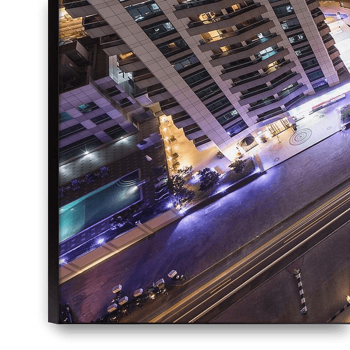 Bestelle das Foto Dubai, Nachtfoto mit leichten Autospuren von Inge van den Brande als Reproduktion auf Leinwand, Alu-Dibond, als Poster, Fototapete oder Acrylglasbild.