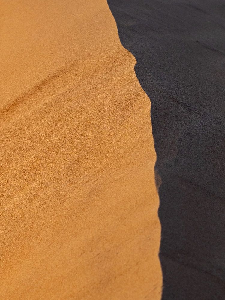 Minimalistisches Foto von Sand und Schatten einer Düne in der Wüste von Oman. Die Orangetöne und das einfache, abstrakte Bild schaffen ein schönes und warmes Bild in Ihrem Zimmer. Das Foto wurde in Oman aufgenommen, in der Wüste Sharqiya Sands, auch bekannt als Wahiba Sands.