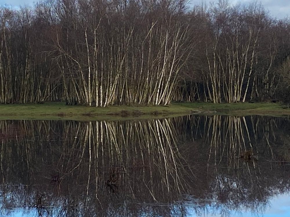 Enge Reflexion von Birken im Wasser. Da es gefroren war und am frühen Morgen noch eine Eisschicht vorhanden war, ist das Bild faltenfrei.