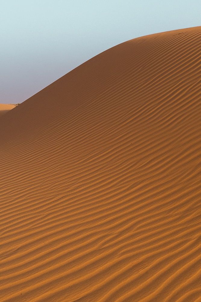 Das Foto zeigt eine weite Wüstenlandschaft, in der sich weiche Sanddünen wellenförmig aneinanderreihen. Im Vordergrund sieht man gleichmäßige, wellenförmige Erhebungen im Sand, die vom Wind geformt werden und ein fast grafisches Muster ergeben. Im weiteren Verlauf erhebt sich eine größere Düne elegant nach rechts, während der Himmel über dem Horizont von einem hellen in ein tieferes Blau übergeht. Das Ganze atmet Ruhe, Leere und Zeitlosigkeit - eine stille Welt aus Formen und Linien, die von der Natur selbst gezeichnet wurden.