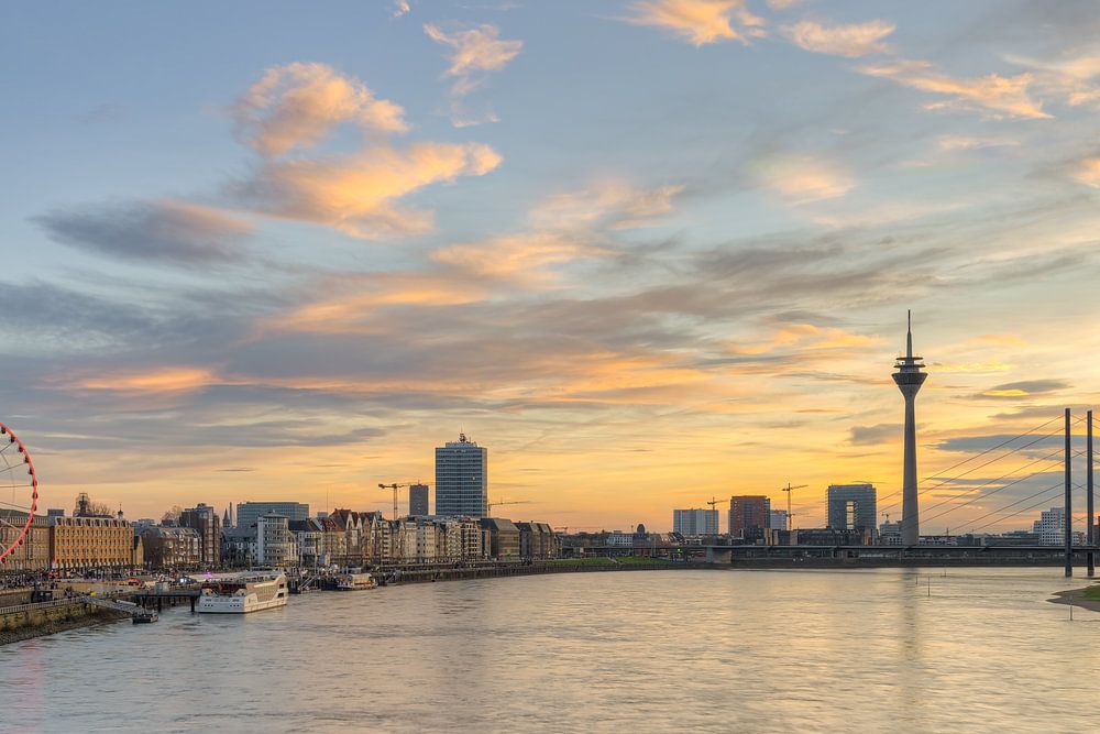 Blick von der Oberkasseler Brücke auf die Skyline von Düsseldorf bei Sonnenuntergang.