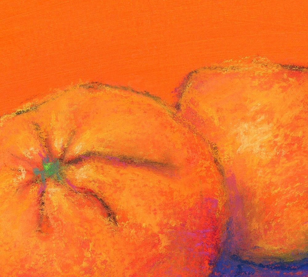 Duett in Orange ist ein Pastellbild im zeitgenössischen quadratischen Format, das von der Künstlerin Karen Kaspar gemalt wurde. Es zeigt zwei frische saftige Orangen, die auf einem abstrahierten Hintergrund in leuchtendem Orange und Blau liegen.