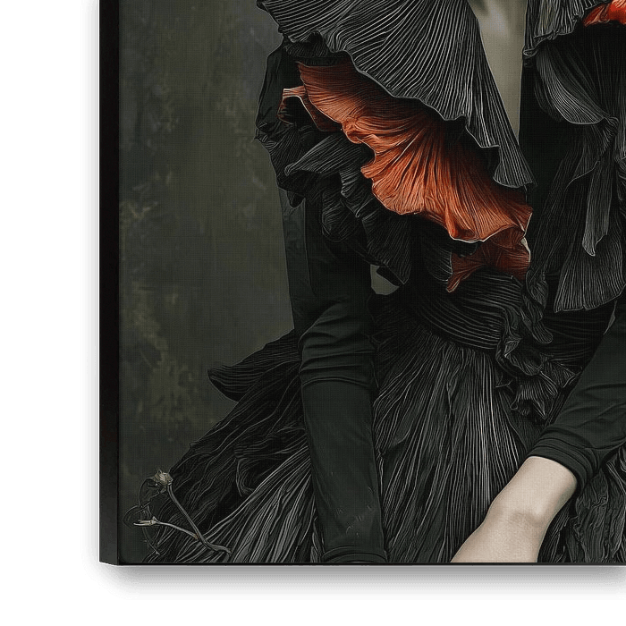 Ein bezauberndes, künstlerisches Porträt, in dem Mode und Natur zu einem düsteren Märchen verschmelzen. Eine dramatische Komposition, in der schwarze Plisseestoffe und korallenrote Pilze eine surreale Krone bilden. Die düstere Atmosphäre wird durch den Kontrast zwischen den zarten Pilzen und dem strengen schwarzen Gewand verstärkt und erzeugt so einen geheimnisvollen und eleganten Eindruck.