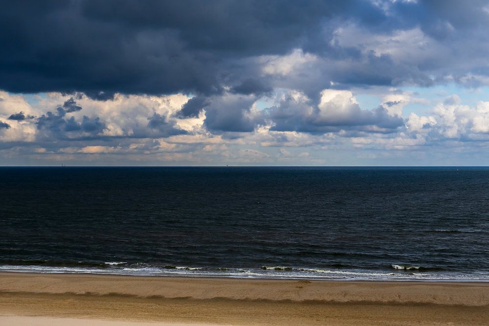 Dunkle Wolken über dem Strand von Petten am Meer. Die Wolken sorgen für den Schatten, der einen schönen Kontrast zwischen Hell und Dunkel auf dem Foto erzeugt.