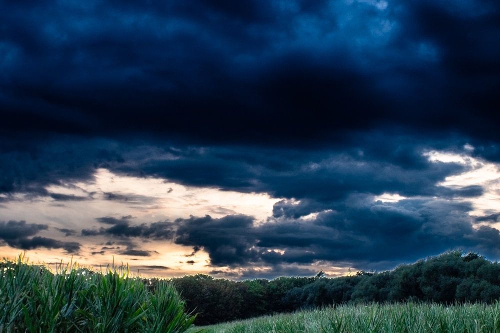 Foto eines Maisfeldes bei Sonnenuntergang. Die dunklen Farben eines Gewitters sind deutlich sichtbar.