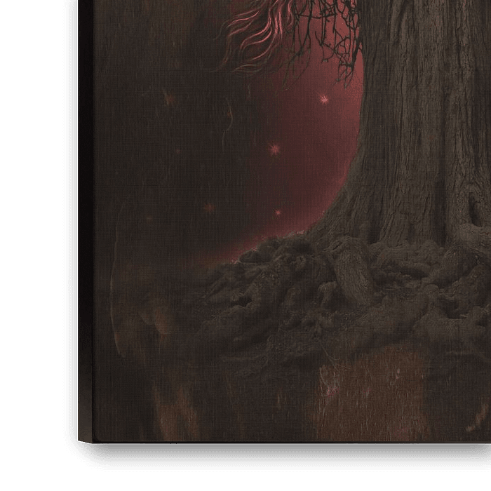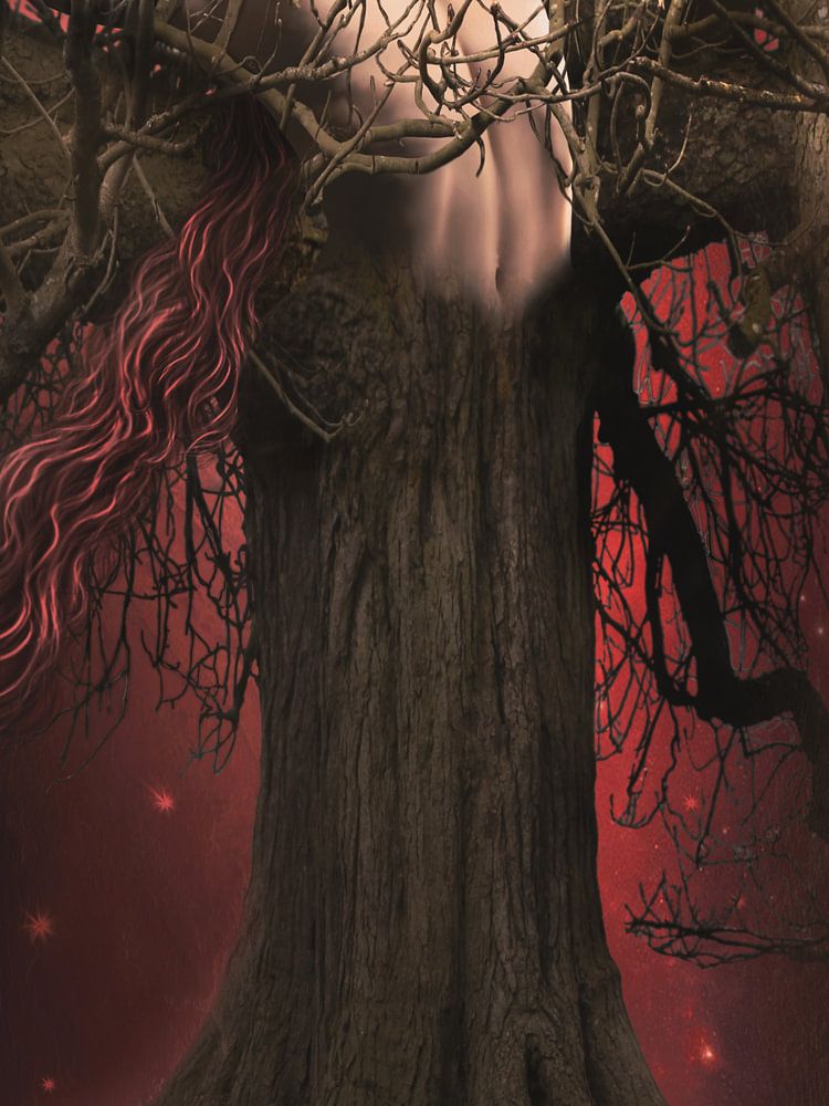 Frau mit roten Haaren verwickelt im dunklen Holz einer Trauerweide