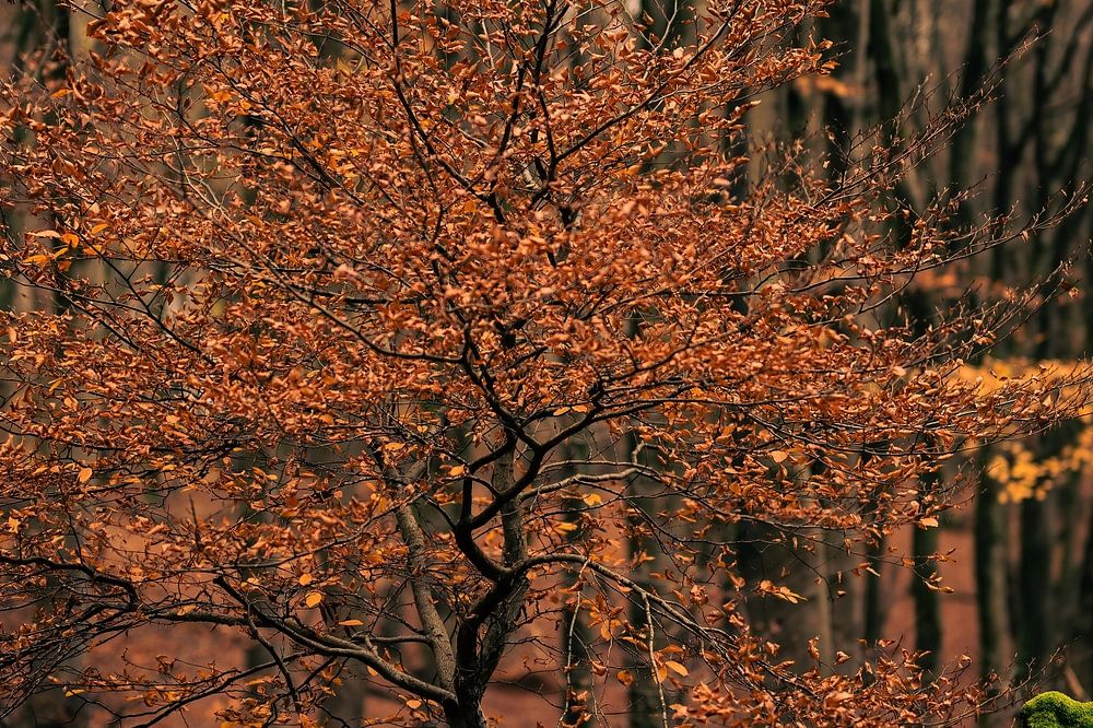 Landschaft auf dem Landgut Duno in Doorwerth, an der Veluwe in Gelderland, mit Blick auf einen Baum mit schönem orangefarbenem Herbstlaub. Im Hintergrund ist der dunkle Wald zu sehen.