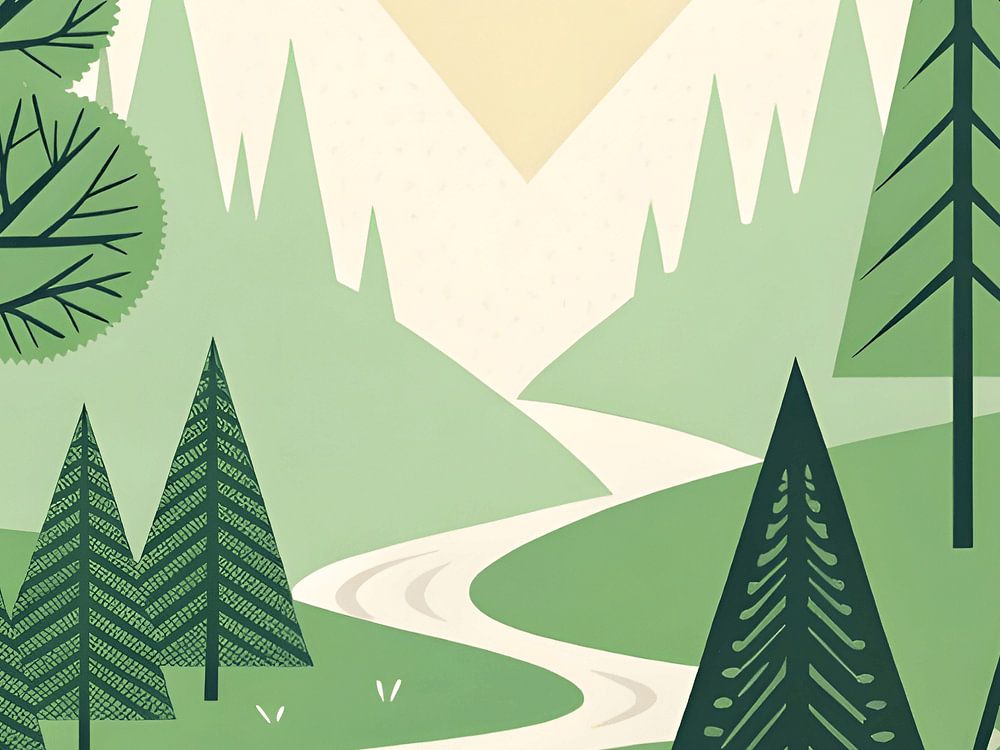 Dieses stilisierte Landschaftskunstwerk zeigt eine heitere Talszene. Ein heller, gewundener Weg schlängelt sich durch sanfte grüne Hügel, die mit verschiedenen stilisierten Bäumen übersät sind. Auf der linken Seite ragt ein höherer Laubbaum mit rundem Laub hervor, während auf der rechten Seite eine Gruppe spitzer, immergrüner Bäume mit verschiedenen dekorativen Mustern zu sehen ist. Im Hintergrund erheben sich sanfte, blassgrüne Berge unter einem hellgelben Himmel mit ein paar einfachen weißen Wolken. Die gesamte Farbpalette ist gedämpft und beruhigend und unterstreicht die Friedlichkeit der Natur.