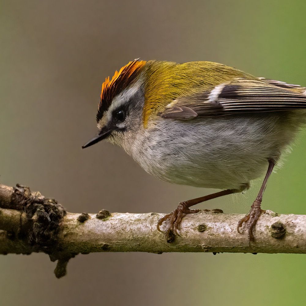 Wunderschöne Aussicht in sanftem Grün mit einem niedlichen bunten Goldhähnchen in der Mitte mit seinem charakteristischen farbigen Hahnenkamm.