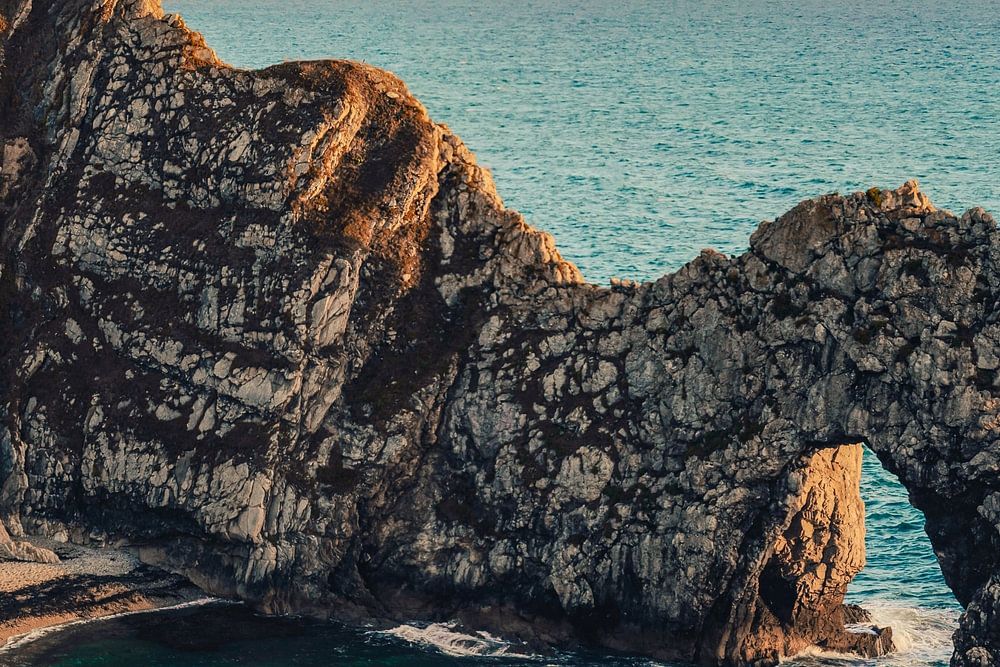 Dieses schöne Foto wurde von Durdle Door aufgenommen, einer natürlichen Brücke aus Kalkstein in der Nähe von West Lulworth (Dorset, Südengland) an der Jurassic Coast am Ärmelkanal.