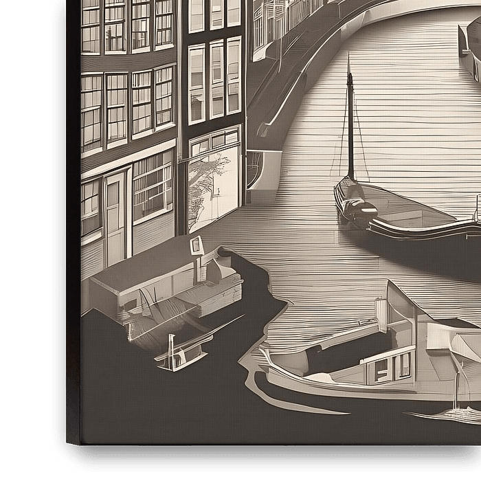 Eine sepia-toned, stilisierte Illustration einer niederländischen Kanalszene. Klassische niederländische Architektur, mit gabled roofs und hohen Gebäuden, zeichnet einen Kanal, der sich sanft durch das Bild schlängelt. Die Gebäude sind in verschiedenen Schattierungen von Grau und Braun gehalten und haben prominente Fenster. Eine…