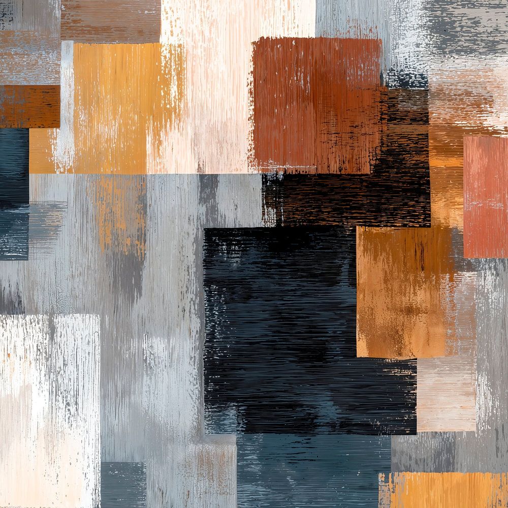 Ein modernes abstraktes Gemälde mit einer geometrischen Komposition aus rechteckigen und quadratischen Blöcken, die mit groben, strukturierten Pinselstrichen ausgeführt sind. Die Blöcke sind schichtweise und überlappend angeordnet, was ein Gefühl von Tiefe und Komplexität erzeugt.